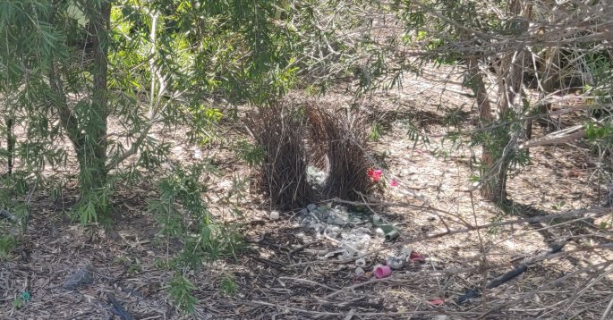 We saw the Bower Bird again and bowers they build to attract a mate. They love pinky things (to match there breeding crests), hence the bottle tops amongst the artfully placed stones and bark in this picture.