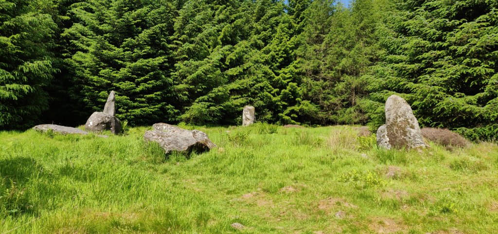 Then we had a 3 mile walk to Louden Wood stone circle. This one had a secret feel to it, snuggled and enclosed in a conifer forest. If I didn’t have the Ordinance Survey App I’d have had difficulty finding it. Sure enough there were more painted pebbles!