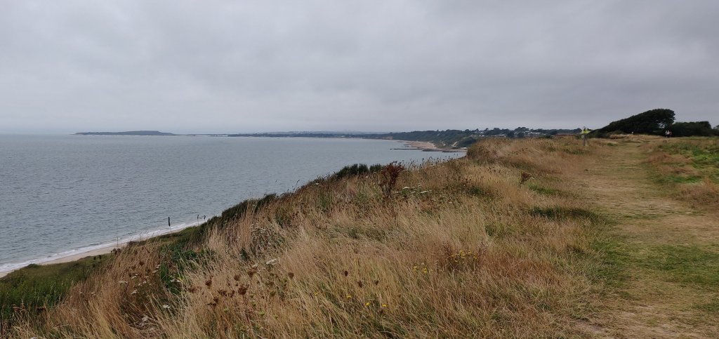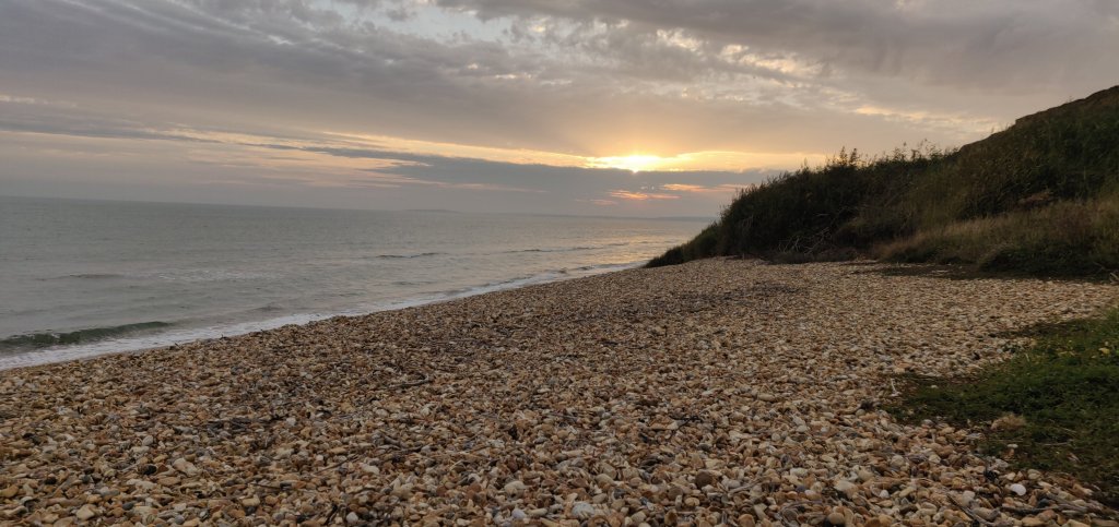 I woke feeling stiff and hungry! The morning was grey and humid but, no storms, hoorah! The Needles on the Isle of Wight that were visible yesterday were cloaked. As my tent was dry I was able to pack up straight away, have a cereal bar and the last of my water before marching to Barton-on-sea in search of a cafe.