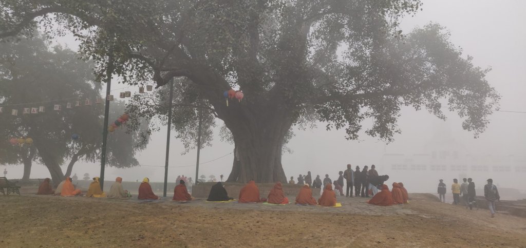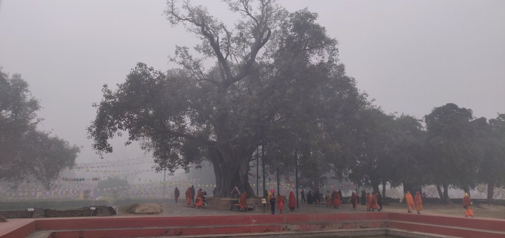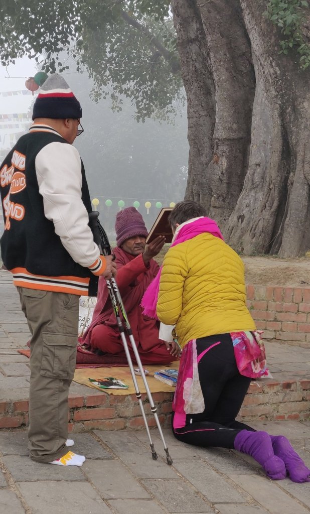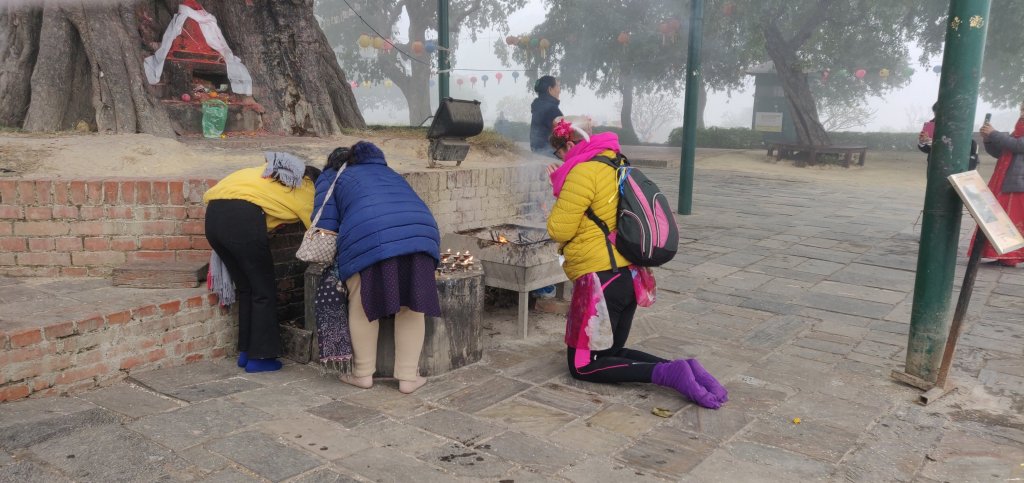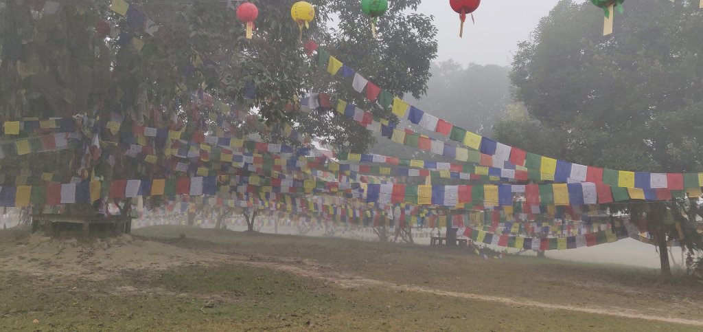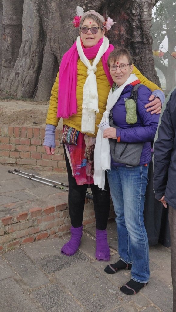 Lumbini the birth place of Buddha was on Clare’s bucket list so, we got there early (it was quite foggy) and made our way to the exact spot within some archeological excavations. I had not visited this the last time due to the queues so, I was very happy. There was so little information about any of it (not even in Nepali) and no photos allowed. The ruins are from 3000 BCE and within the covered area, the remains appear to be mud bricks. It seems rather odd that a ‘dig’ should have so many prayer shawls draped all over it, can you imagine that at York or Tintern? We continued to wander outside and around the much later (fired brick) walls of an early temple and to a Buddha Tree that Buddha’s mother apparently rested under on her way to the place where she gave birth. Here were many monks and Clare who is Christian took her time for prayer. We both recieved blessing scarfs, tikka and a band around our wrist from one monk. This felt to me a very natural thing this time (something I did not feel in the Pashupatinath at all). Maybe the huge old tree (over 2000 years old) had something to do with it. We lit butter candles and incense sticks. We gave a small offering of money but, it was not a requirement.