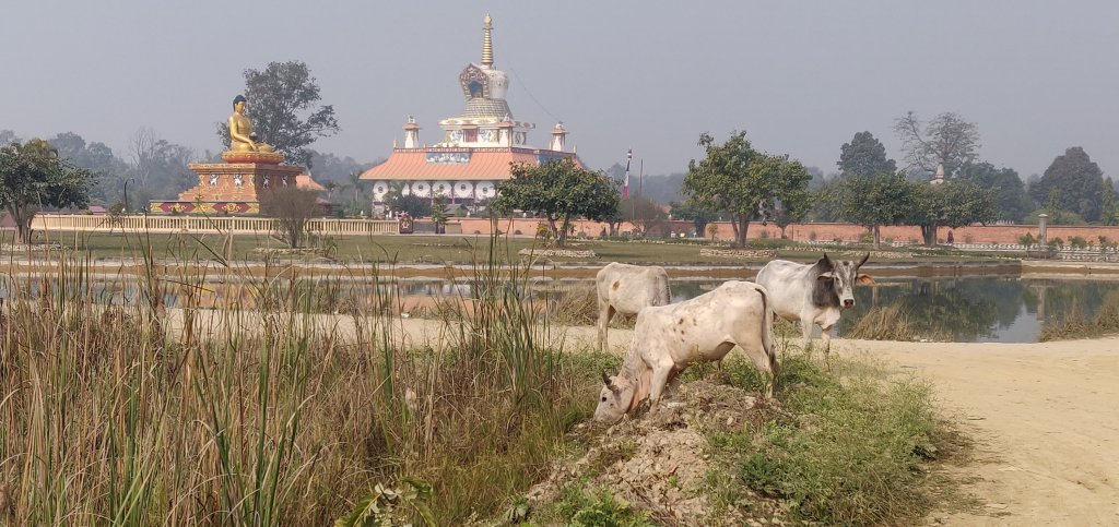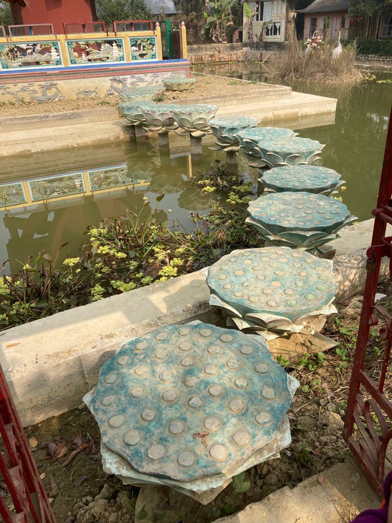 I would like to give you a potted history of Lumbini but it’s not possible. It was rediscovered in 1895 and ratified by various historians, archeologists etc. It is another UNESCO world heritage site. It’s an extremely holy site and the government is in the process of developing it, not with houses but with temples. I know I showed you some of the temples before and we visited some of these but, we also, walked a little further this time to visit the Vietnamese Temple. It was extraordinary, it looked abandoned, the gardens unmanicured and there were vegetable plots dotted about in it. Statues of animals and birds throughout the gardens and apart from the people on the door we saw only one female monk sweeping in the grounds. We did hear children chanting in the buildings at the rear.