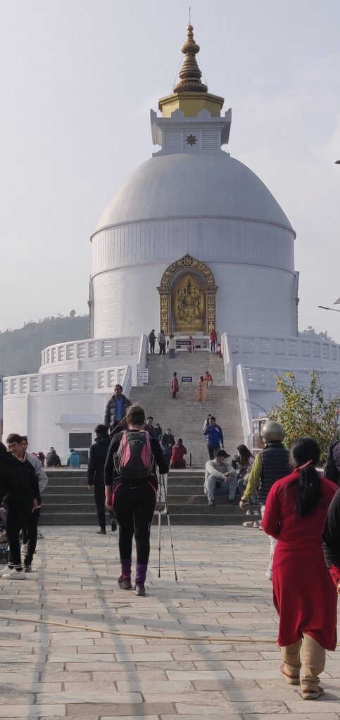 The next day I was rather disappointed because it was hazey. I knew the veiw from the balcony on a clear day was amazing but I kept quiet and we set off on a walk to the Peace Pagoda above Lake Phewa. It’s only four miles but, two of those are a 300 meter steep climb. This was a trial for Clare’s foot and fitness but, we made it. I feel a bit more confident about our impending trek now, although I’m not sure Clare feels the same!