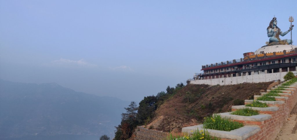 While wandering about Clare noticed a very strange tikka on the forehead of some of the Asian visitors, three white horizontal stripes and red dot in the center. Clare asked where it was from and then immediately wanted to go to that Temple, Pumdikot which was perched on a another hill a mile away! There was absolutely no way we could walk there before dark so we negotiated with a taxi. The Driver took us 200 meters up this hair raising track, all mud, rubble and stone and he managed to blag his way right to the top, citing Clare’s poorly foot as an excuse, I think the waking poles made him think we needed assistance, little did he know we’d walked from Pokhara.