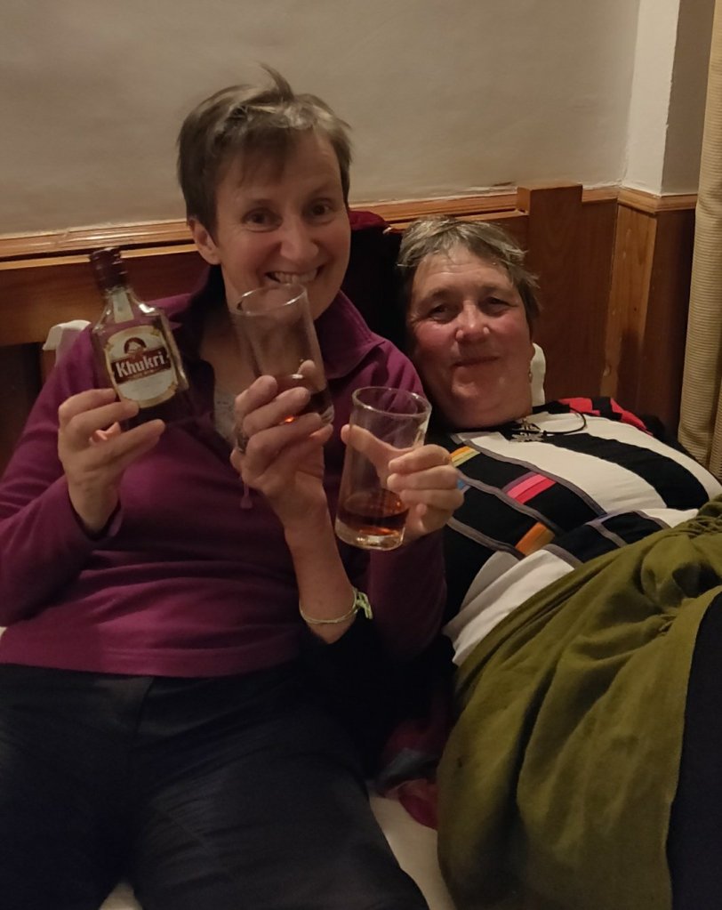 Tried, dirty and in Clare’s case more than bruised, we watched the sun go down, had our dinner and. Later we invited Rajkumar and Sabin in for a tot of Rum before we said our good night’s.