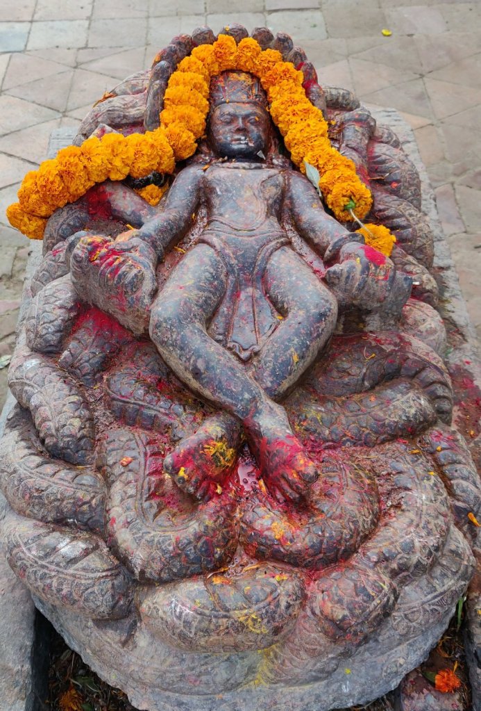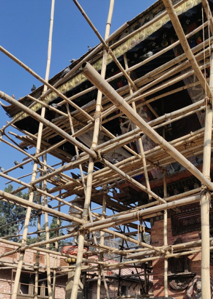Unfortunately this place was very severely damaged by the earthquake in 2015 so the main Temple is under restoration. I think the bamboo scaffolding is amazing in itself. Rajkumar told us about the various effigies and incarnations of the god Vishnu (to whom the temple is dedicated) all dotted about the place and one stone that was a partially carved cow that apparently started to bleed so the carving stopped and the stone was just left in situ with no blood in sight.