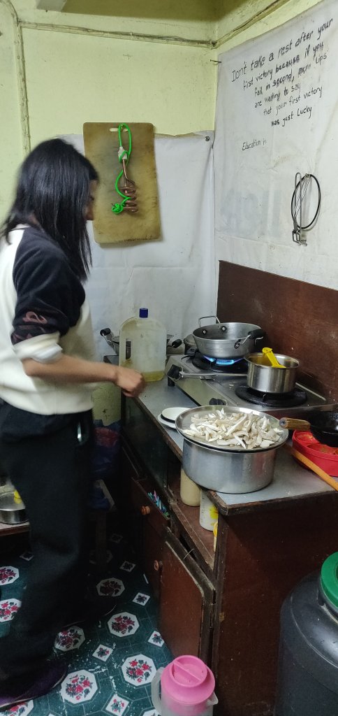 Then I met up with Rajendra, Shova and one of their daughters, Retsha in Kirtipur and spent a very pleasant afternoon with them. Both Shova and Retsha cooked traditional Newari food in their little kitchen/bedroom.