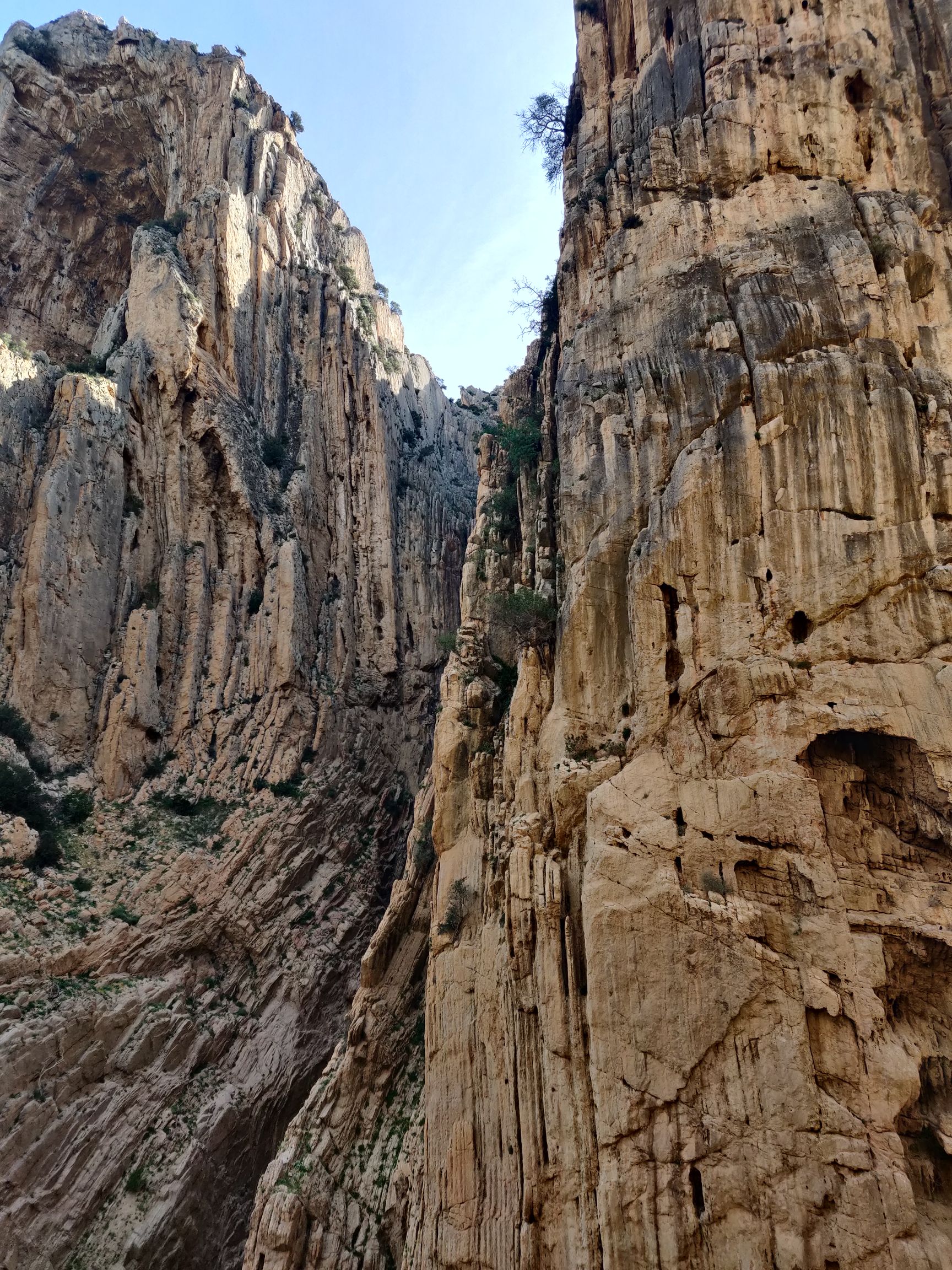 The rock had been sculpted into huge cauldrons below us over millennia. Dark rock doves flying everywhere. At one point a high-speed train thundered by making everyone jump. Blink and you missed it! Above the remains of other trails suspended at terrifying heights.