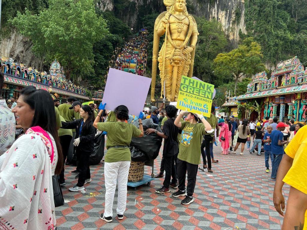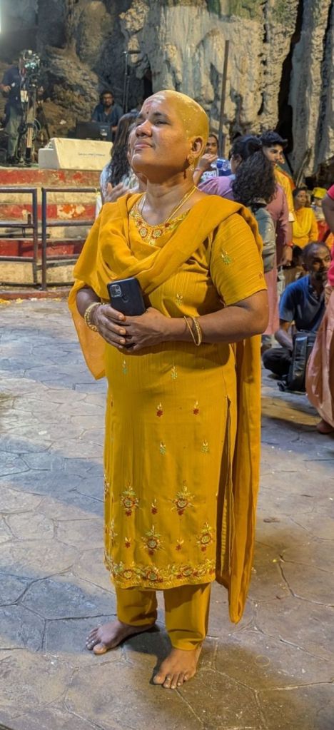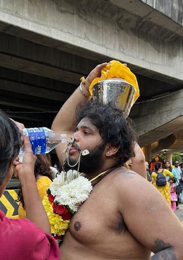 The event takes place at the Batu Caves. The pilgrims wear yellow and often have their heads shaved, and covered in a yellow paste this includes women and children.