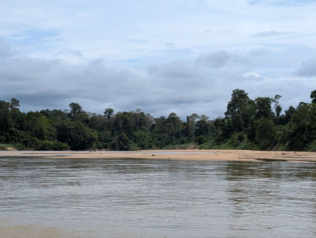 We had to catch a boat to the village we were going to stay in. The Boat ride was three hours and not quite as tranquil as I had imagined. The noise of the motor drowned out all sound as it whisked us up the River Temberling. The river itself is muddy looking with all the sand and silt suspended in it but apparently it’s unpolluted. Sand dunes had developed in some places and clearly it was quite shallow. At odd intervals there were bottles suspended presumably over fishing pots. Also plenty of people fishing.