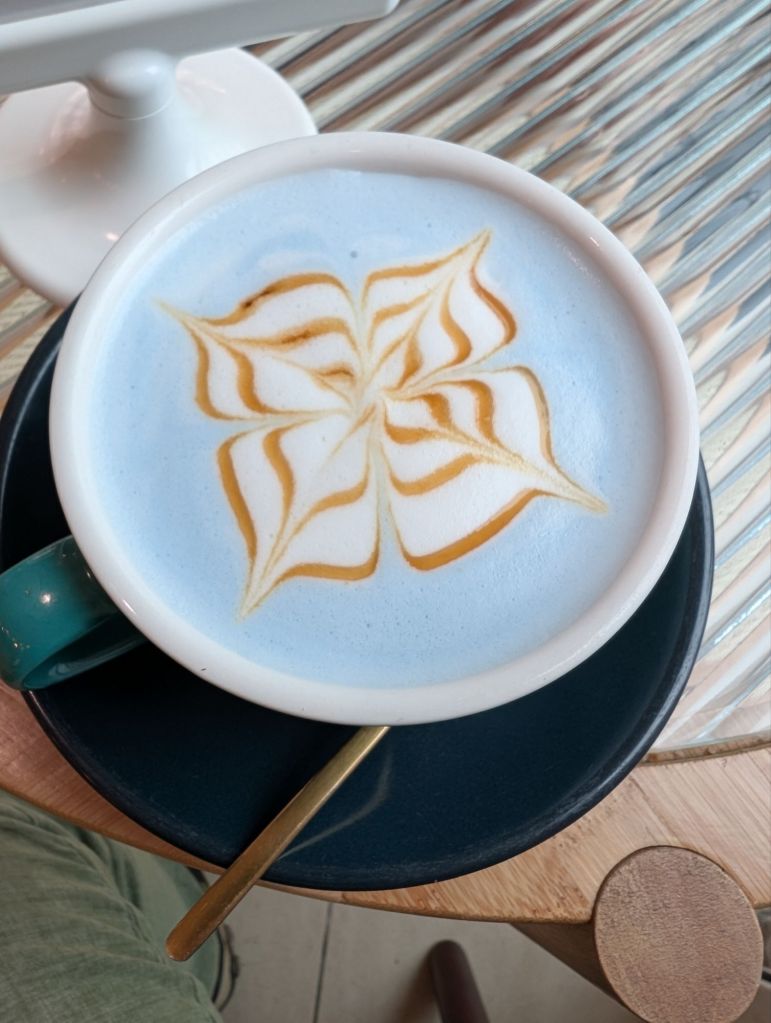 I’ll pop this picture in as it was what we had in a cafe, really a coloured hot milk I think, the Blue Pea flavour not coming through at all.