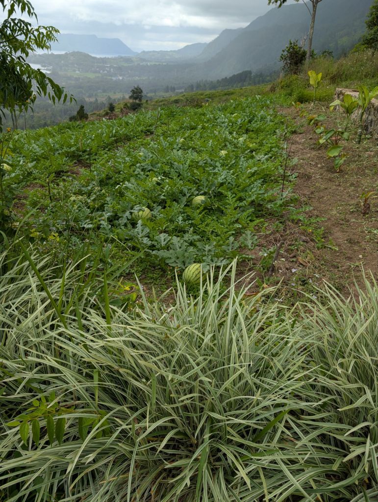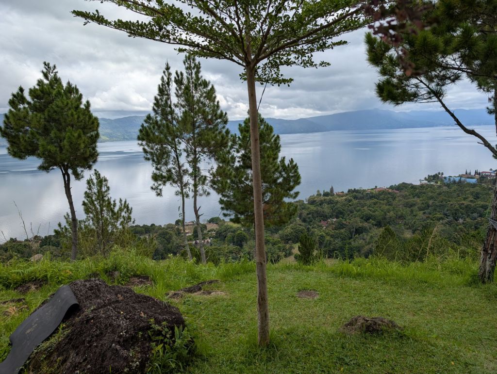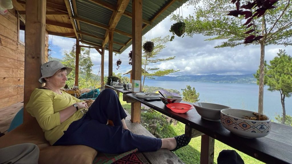 We visited Pea Farmhouse (same meaning but pronounced Peah). This gorgeous spot overlooking the Lake Toba is owned by Efrida’s brother Hery. He worked of a few years on the cruises as a cook and has been running this place for four years. He runs the Farmhouse as a camping area, and provides the tents and bedding for his guests, meals and drinks also. The area is close to the mountainous spine of Samosir a very steep ridge ( from the east side of the island at least)