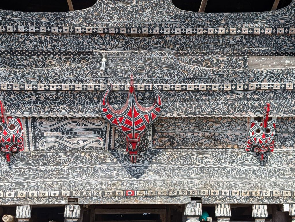 They are extraordinary wooden structures, originally no nails involved at all. The original would have had a kind of shingle roof or palm leaf thatch. The modern equivalent is corrugated iron. The houses are airy inside and quite cool compared to outside. They come in various sizes and nowadays have an extension on the back. Traditionally a group of families would live in one house, some of the buildings were for storing rice and the others for cloth I think.