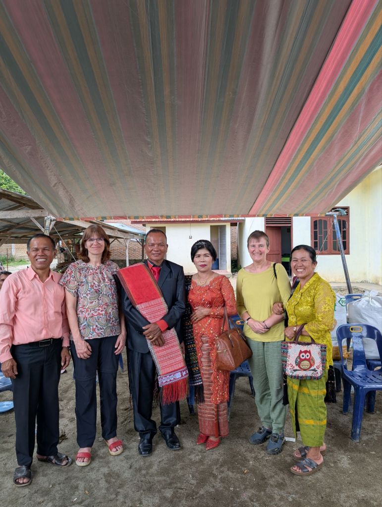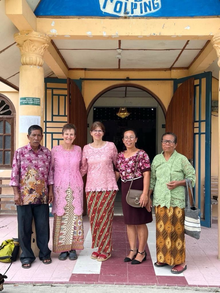 Ibu (dressed in a normal skirt and top) headed off on her motorbike to take someone to the church and was going to come back for us so, we started walking. My skirt/sarong was narrowed at the bottom, so I couldn’t walk with a natural gait, it is designed to make you walk demurelyp. I hitched it up a bit. (Tatjana’s was stretchy) The Kabaya top is lined and so I was very quickly hot. If you know me this is definitely not my style, pink lace and a skirt!