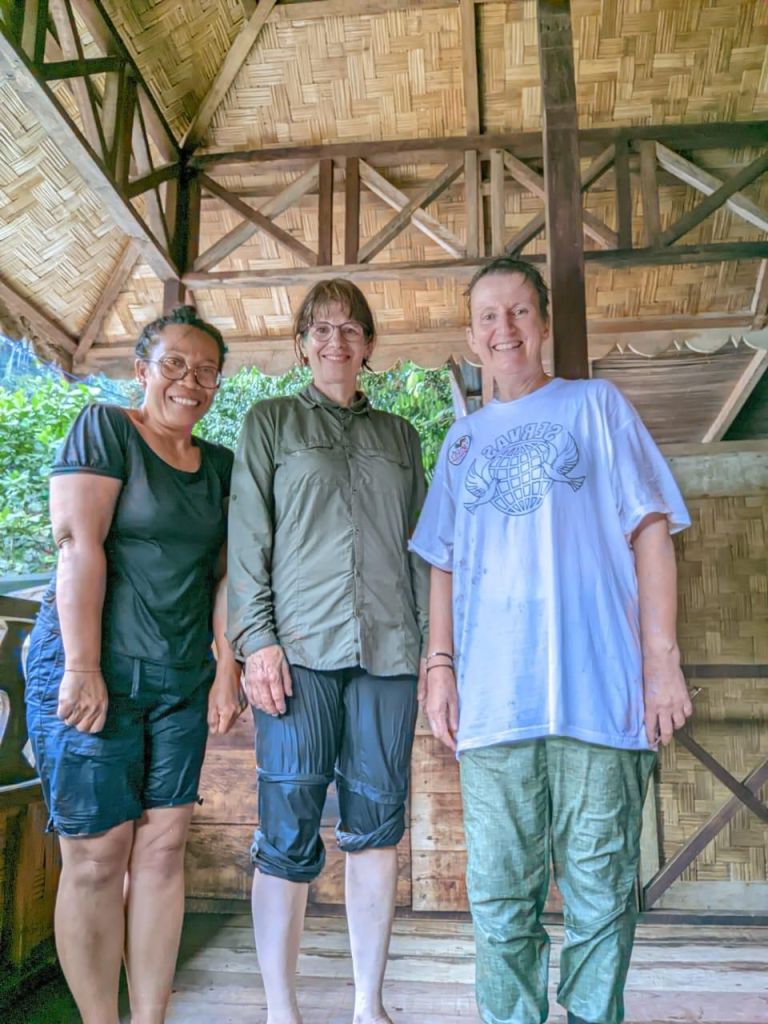 Here I learned something as I tried and failed to walk through the water, keep walking up/into the current, my legs just wouldn’t set down where I wanted them and in the end Ibu and Ando each took an arm and walked me across, Tatjana strode across unaided. We sat and had lunch on a beach by the river (no monkeys here). This time it was noodles and lots more fruit, half a pineapple each with passion fruit spooned over it!