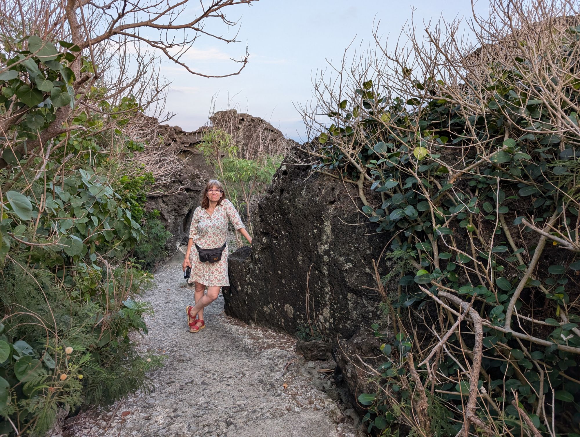 Around this part of the journey we visited some more caves but, these were all managed with cemented floors and steps to reach the higher ones. The climb up was hot but, interesting to me because the caves that are now 50 to 60 meters up the rock face. These were at one time on the shore, showing the Island is being pushed upwards constantly. Apparently human artifacts in the caves suggest people inhabited it when the island was just poking out of the sea! At the top was a cave that had become a temple. The smell was so bad, urine and something else (ammonia?) that Tatjana had a physical pain in her head. There was a man, maybe a monk/hermit and Formosan Rock Macaques, (presumably being fed here). We didn’t linger because the smell was so terrible.