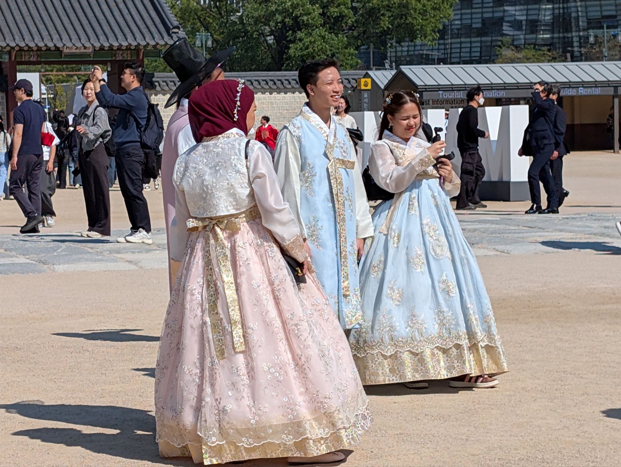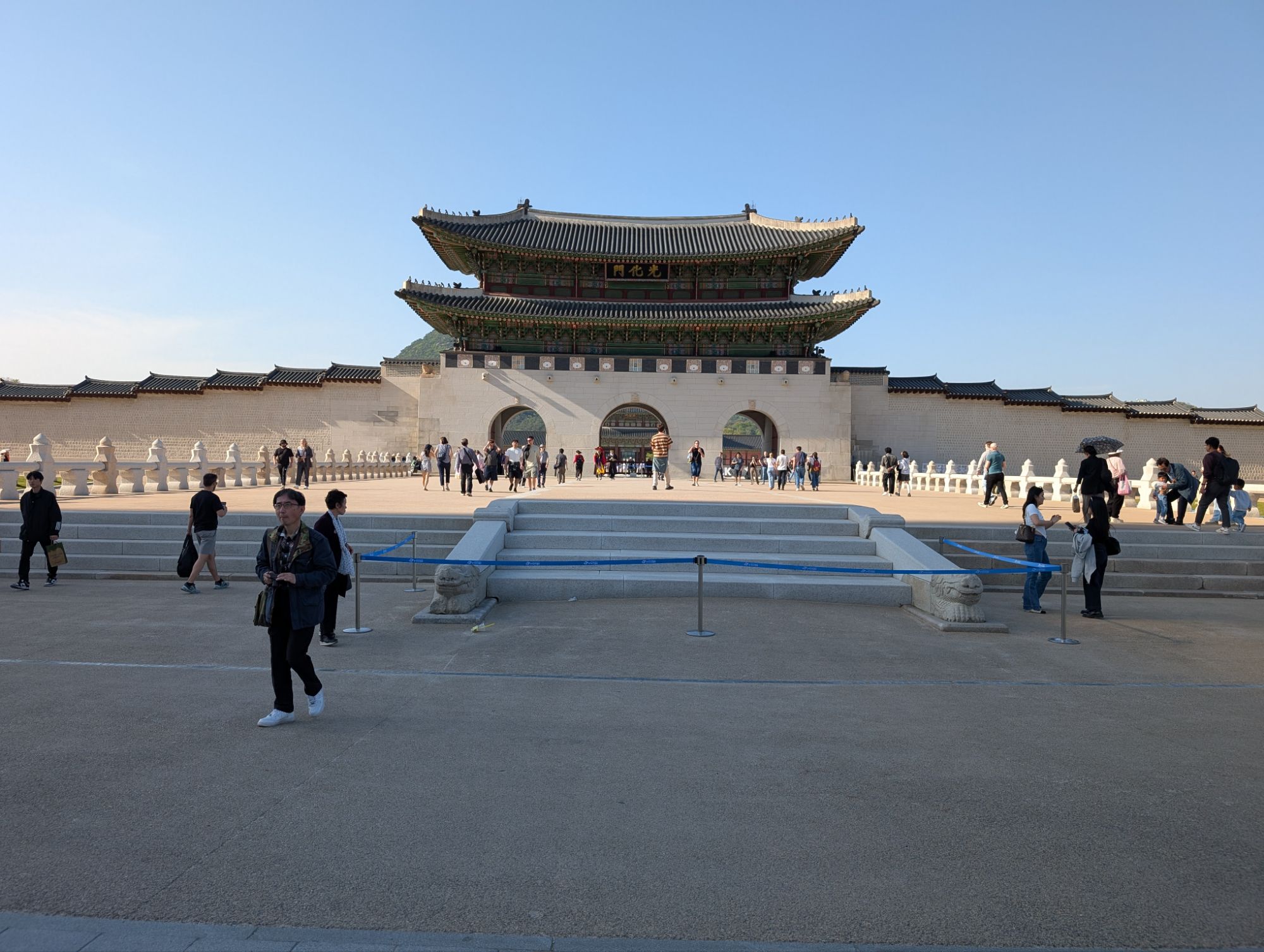 We then wandered up to the Gyeongbokgung Palace and there was an event going on! Entry was free and almost everyone was wearing the traditional dress the Hambok. The palace buildings are somehow heavier more robust looking than the ones we have seen in other countries, with a dark roofs (and little ornamentation) and the decorations on the wood was overall jade green and not the red and gold of the Chinese Temples.