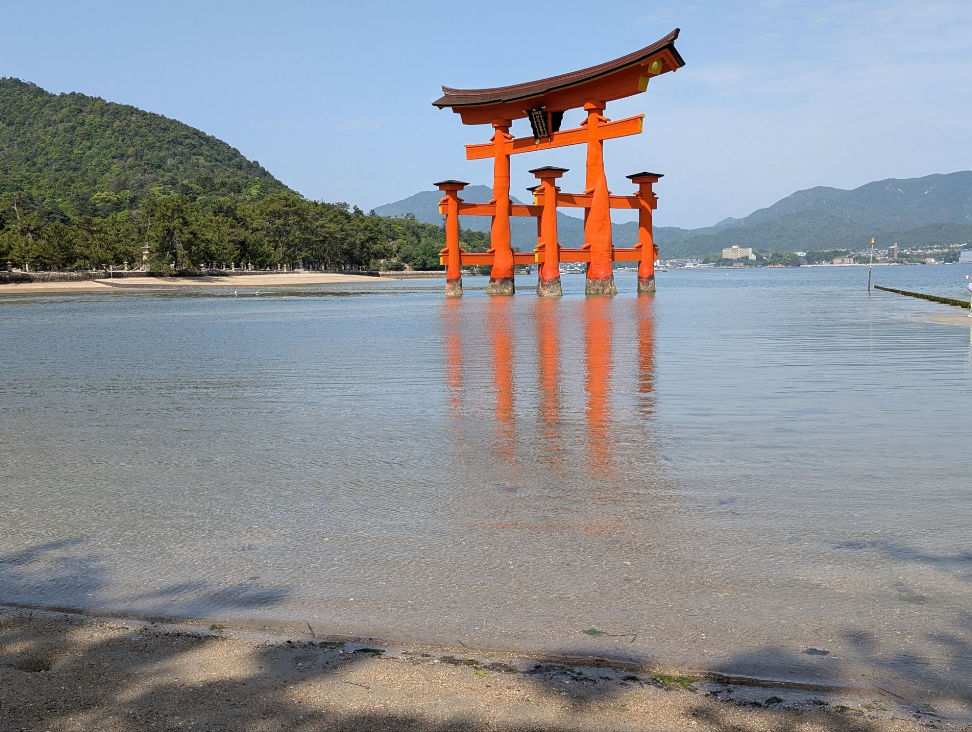 The a ferry to the Island, and our first sight of the Torii Gate partially submerged. There are Torii Gates to Shinto Shrines and as you go through them you enter the sacred or spiritual world, it’s a very Japanese thing!