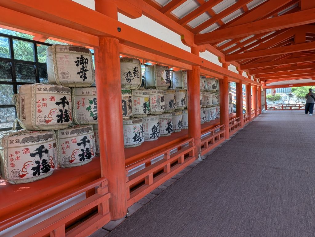 We wandered around the shrine which is quite spare and lacking in ornamentation apart from a couple of lions and lanterns. I did see a few things I felt were a little ironic. For instance Sake barrels, gifted to the shrine but very clearly advertising! Of course there are the blessings and prayers to buy and I might have bought a few!!!