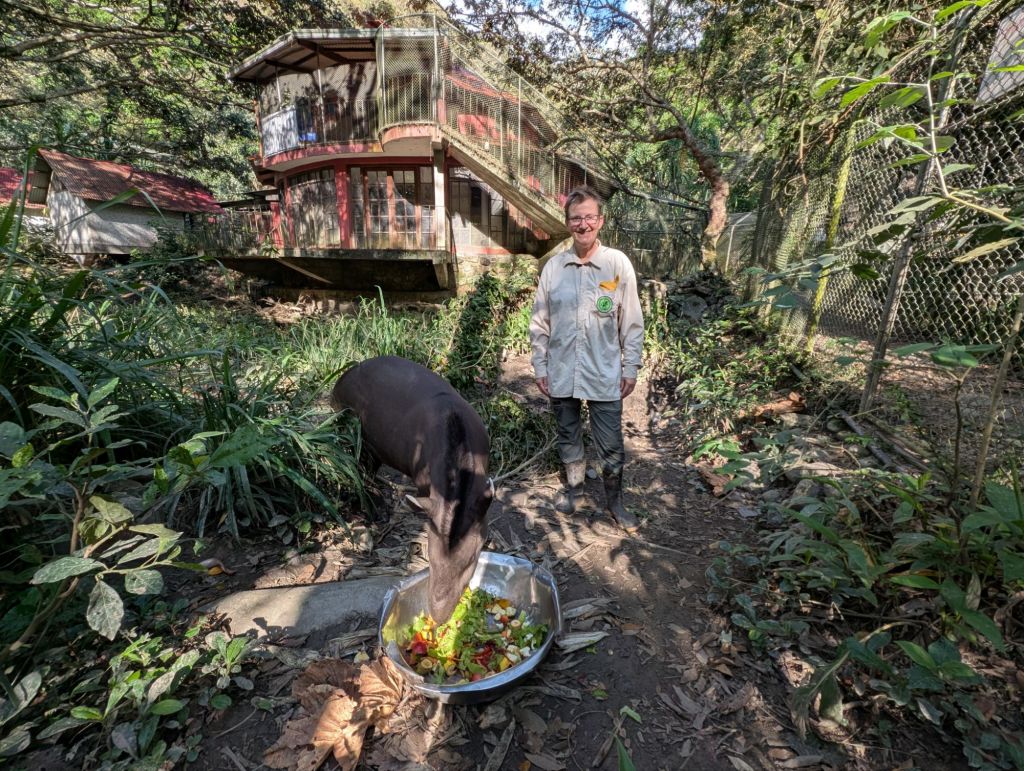 We move onto the Lowland Tapir, wow what an amazing animal, this one is tame to a point, he is big and male. His enclosure backs onto our hut so sometimes he greets Jayne and I with the sweetest noises, a bit like Yoshi in SuperMario. He also enjoys a lie-in because they are normally nocturnal which means we have to call him for breakfast. I was able to touch him once and he is all muscle!