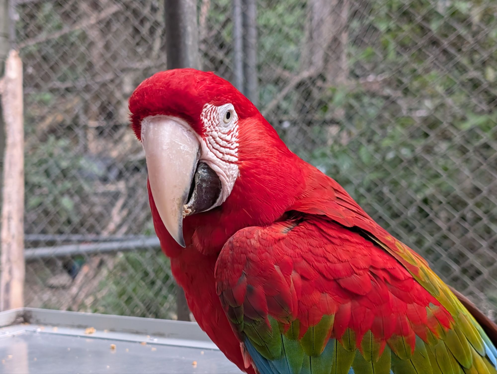 You are not supposed to talk to the parrots, to try and give them a more natural existence and not to traumatised them. Occasionally a couple of birds said ‘Hola’, ‘Hello’ and the odd wolf whistle. Clearly they had been pets. As I went round the enclosures I began to notice some of the birds had either paired up or had favourites and would sit, fly and feed together all day. They are unbelievably noisy and after a while it sounded very like gossiping! Some had behavioural problems and would peck me while I was working (Jayne said that was sensible), I quickly learned to put the bucket between me and them.